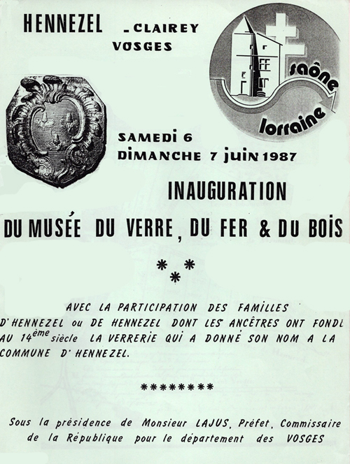 Le musée du verre est situé à l’entrée du hameau de Clairey, à 1 Km 5 d’Hennezel dans la demeure « La Résidence », ancienne propriété de la verrerie de Clairey (fermée en 1952). La première salle est consacrée à l’histoire du verre (fin du Moyen-Age) : le rôle de la famille d’Hennezel y est bien sûr évoqué. En 1986, l’association Saône Lorraine a aménagé, au second étage, un vaste espace et l’a subdivisé en salle du verre, du fer, du bois, de la broderie. Une salle consacrée à la résistance et l’abbé Mathis, curé martyr d’Hennezel, fut ouverte en 1987. Ce musée est le fruit de la collaboration entre Saône Lorraine et la municipalité d’Hennezel, propriétaire des lieux. Il n’est pas de village situé dans un rayon de 10 Kms autour d’Hennezel qui ne porte une trace ou un souvenir lié au nom de la famille d’Hennezel. - tombes dans les cimetières - vitraux dans les églises - nombreuses pierres de fondation sur les façades des maisons.
